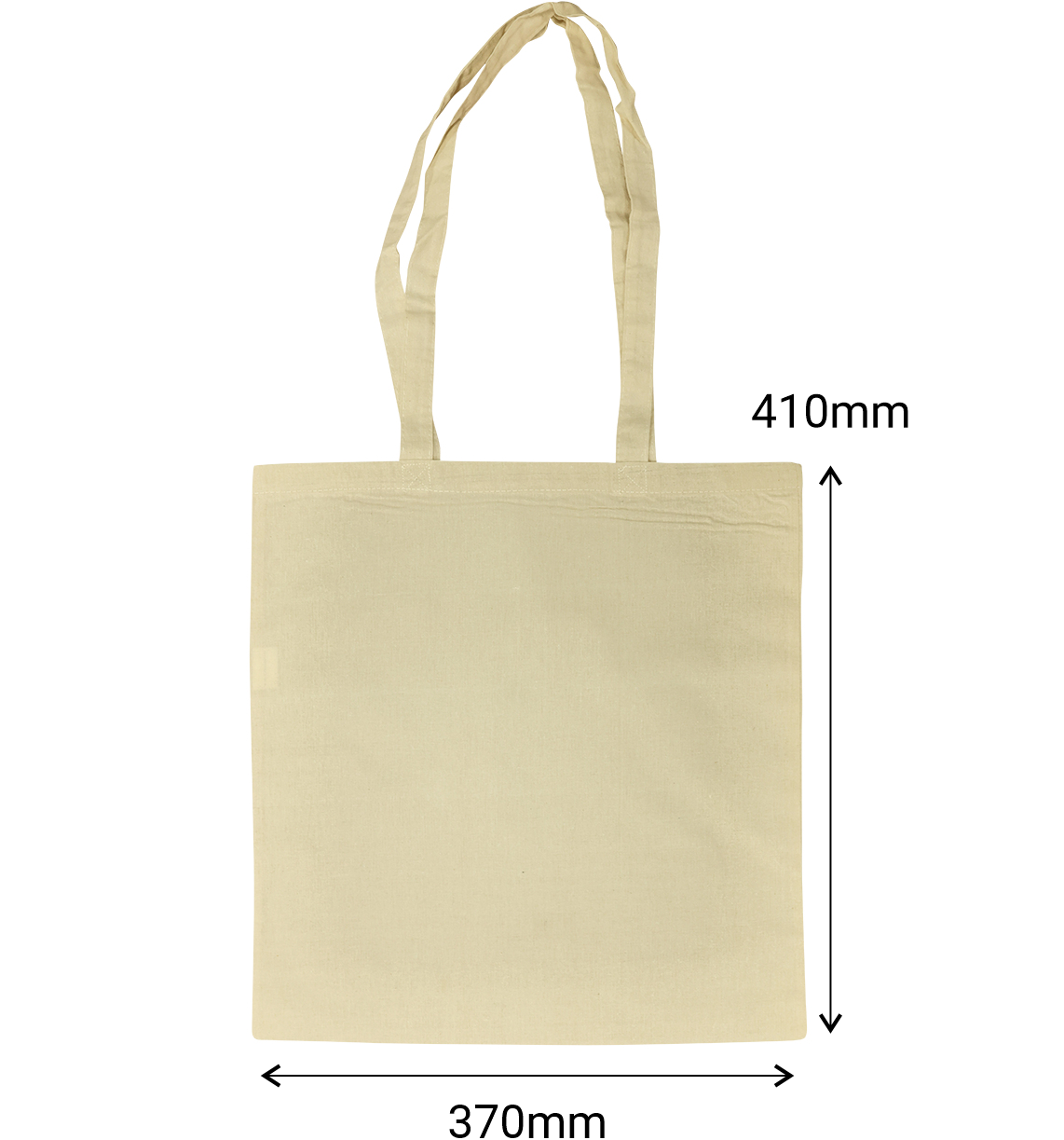 Our budget friendly Natural Calico Tote Bags are 37cm wide x 41cm high with two long handles. Handles are approximately 35cm from the top-centre of bag to top-centre of handles. Handle straps are 2.5cm thick. Made from 130gsm, 100% cotton with cross stitched inside seams for strength.