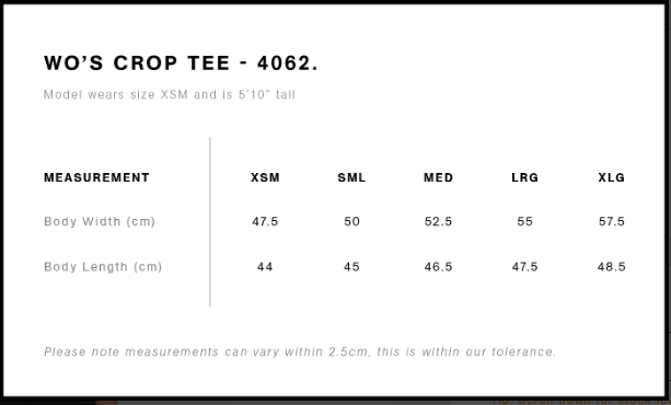 FIT: Relaxed fit - please check the size chart below to avoid disappointment. Lay your own tee flat on a table, measure armpit to armpit across the chest and match to the size you feel is best. Please note measurements can vary within 2.5cm, this is within the accepted tolerance.